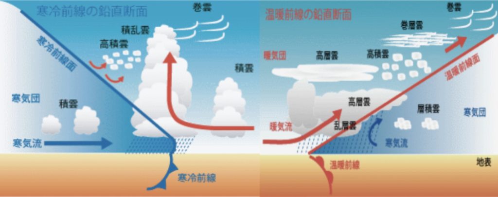 ・寒冷前線(密度の高い寒気)の速度>温暖前線(密度の低い暖気)の速度