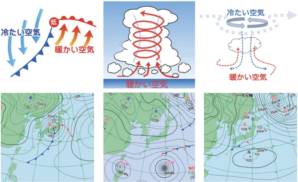 ・南側に蛇行(気圧の谷)→反時計回り→低気圧